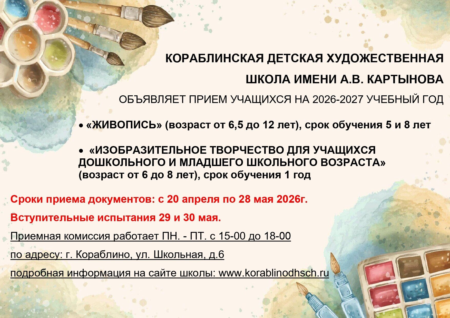 Кораблинская детская художественная школа открыта 1 сентября 1975 года на основании приказа по Районному отделу культуры № 47а. Сегодня школа является центром художественно-эстетического образования и воспитания учащихся города и района, и ее деятельность остается неотъемлемой частью культурной жизни города. Талантливые и опытные педагоги, больше половины которых выпускники этой школы, преподают учащимся основы изобразительной грамоты, развивают творческие способности, воспитывают эстетический вкус детей, готовят их к поступлению и обучению в средних и высших учебных заведениях художественного профиля. Визитной карточкой школы являются кружевоплетение на коклюшках и керамика, что способствует сохранению и популяризации основ национальной культуры. Поддерживать высокий профессиональный уровень подготовки учащихся помогает участие в конкурсах и фестивалях. Школа живет интересной, насыщенной жизнью. Дети с удовольствием принимают участие во внеклассной жизни школы. День знаний, посвящение в юные художники, новогодние елки, последний звонок, выпускной, ставший традиционным школьный конкурс рисунка «Символ года» – много интересного в школе для юного художника. Да и преподавателям есть, где проявить свои творческие способности: в школе более 40 лет работает студия декоративно-прикладного искусства «Художник». В ноябре 2020 года открыта памятная доска основателю и первому директору школы Александру Васильевичу Картынову, а с 1 декабря 2020 года школа носит его имя. Поддерживать высокий профессиональный уровень подготовки учащихся помогает участие во всероссийских, межрегиональных, областных и зональных выставках, конкурсах и фестивалях.